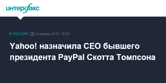 Нью-Йорк. 4 января. INTERFAX.RU - Главным исполнительным директором Yahoo! Inc. назначен Скотт Томпсон, занимавший ранее пост президента компании PayPal, являющейся подразделением eBay, сообщает MarketWatch. С.Томпсон вступит в должность с 9 января. Финансовый директор Yahoo! Тимоти Морс, временно исполнявший обязанности CEO компании, вернется к работе финдиректора.