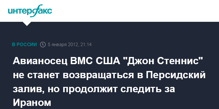 Вашингтон. 5 января. ИНТЕРФАКС - Американская авианосная группа во главе с авианосцем "Джон Стеннис" не будет возвращаться в Персидский залив, откуда она вышла перед Новым годом в Индийский океан, пройдя через район крупномасштабных учений военно-морского флота Ирана, сообщают источники, близкие к ВМС США.