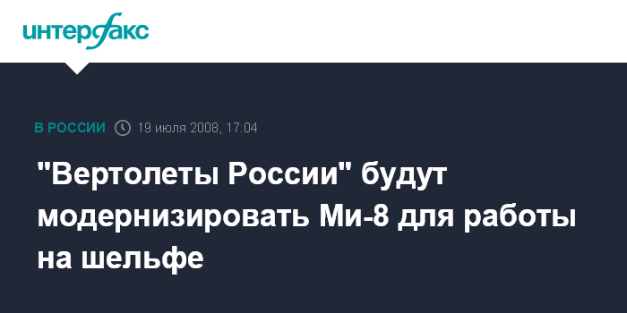 Москва. 19 июля. INTERFAX.RU - Компания "Вертолеты России" разрабатывает проект глубокой модернизации вертолета Ми-8 для использования его на северных нефтегазовых месторождениях и шельфе, сообщил журналистам генеральный директор компании "Вертолеты России" Андрей Шибитов.