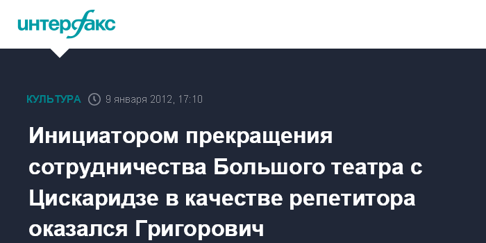 Москва. 9 января. INTERFAX.RU - Расторжение контракта с Николаем Цискаридзе и Яном Годовским на осуществление педагогической деятельности в Большом театре произошло по просьбе Юрия Григоровича, рассказали в понедельник "Интерфаксу" в пресс-службе театра.