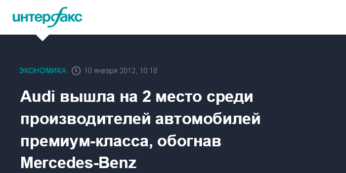 Берлин. 10 января. INTERFAX.RU - Audi AG в 2011 г. вышла на второе место после BMW AG среди крупнейших мировых производителей автомобилей премиум-класса, обогнав Mercedes-Benz, пишет газета The Wall Street Journal.
