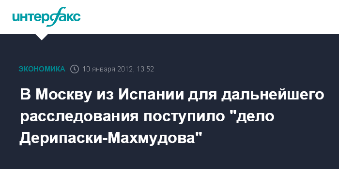 Москва/Мадрид. 10 января. INTERFAX.RU - Материалы уголовного дела в отношении российских предпринимателей Олега Дерипаски и Искандера Махмудова, которое ранее расследовали испанские следователи, поступили в Москву, сообщили информированные источники "Интерфакса".