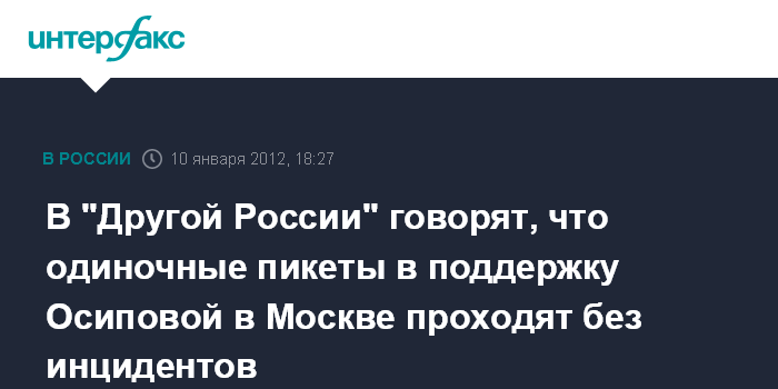 Москва. 10 января. INTERFAX.RU - В оппозиции заявили, что не испытывают проблем с проведением во вторник вечером многочисленных одиночных пикетов в поддержку активистки "Другой России" Таисии Осиповой, которую смоленский суд приговорил к 10 годам тюрьмы за наркотики.
