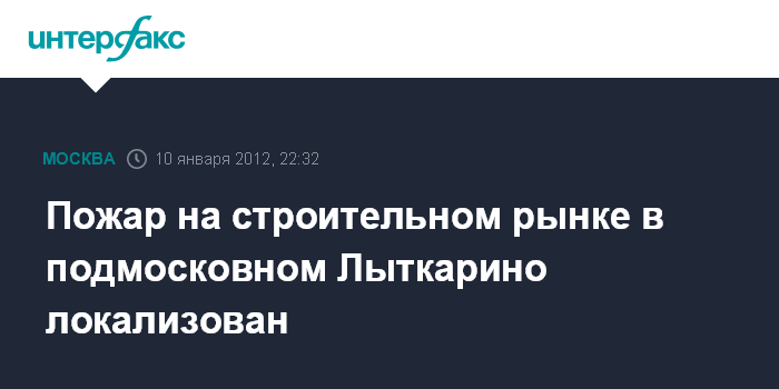 Москва. 10 января. INTERFAX.RU - Пожарным удалось локализовать пожар на складе строительного рынка в подмосковном Лыткарино, сообщил начальник пресс-службы МЧС по региону Юлия Гаврикова.