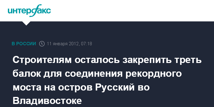 Владивосток. 11 января. ИНТЕРФАКС-ДАЛЬНИЙ ВОСТОК - Строители моста через пролив Босфор Восточный на остров Русский во Владивостоке продолжают работы в круглосуточном режиме: общая длина выдвинутых навстречу друг другу над проливом участков составляет 756 метров при общей длине руслового пролета 1104 метра.