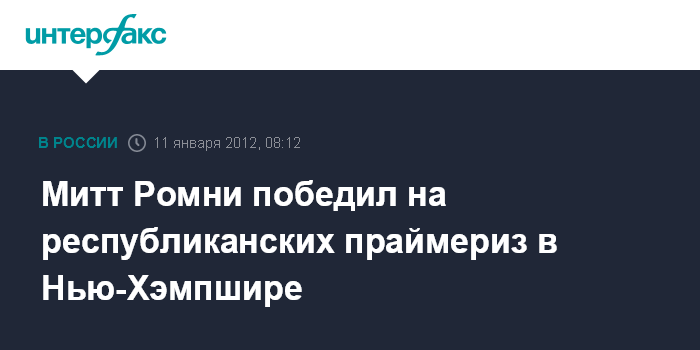 Лондон. 11 января. INTERFAX.RU - Митт Ромни, бывший губернатор штата Массачусетс, одерживает уверенную победу на первых праймериз кандидатов президентской гонки от республиканской партии в штате Нью-Хемпшир, сообщает агентство Bloomberg.