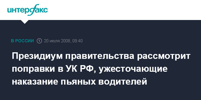 Москва. 20 июля. ИНТЕРФАКС - Президиум правительства рассмотрит на заседании в понедельник проект федерального закона о внесении изменений в статью 264 УК РФ. Законопроект направлен на усиление уголовной ответственности за нарушение Правил дорожного движения водителями, находящимися в состоянии алкогольного или наркотического опьянения, сообщается на сайте кабинета министров.