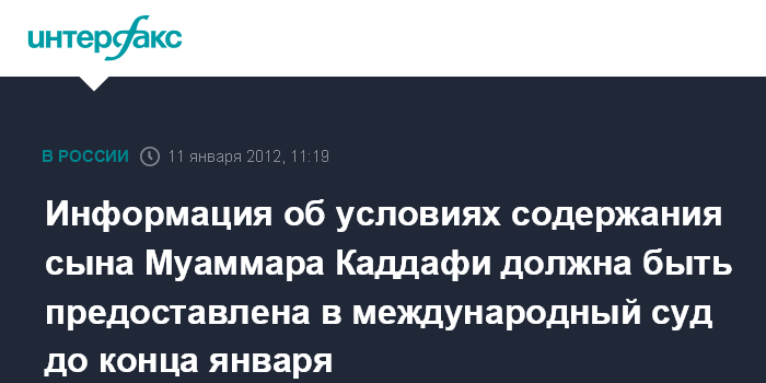 Лондон. 11 декабря. INTERFAX.RU - Международный уголовный суд (МУС) продлил срок, в течение которого ливийские власти должны предоставить информацию об условиях содержания Сейфа аль-Ислама Каддафи, сообщает британская телерадиокорпорация BBC.