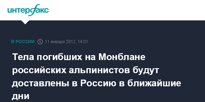 Москва. 11 января. INTERFAX.RU - Работа по возвращению в Россию тел погибших на Монблане российских альпинистов супругов Захаровых идет в штатном режиме, сообщили порталу "Интерфакс-Туризм" в сервисной службе страховой компании РОСНО.