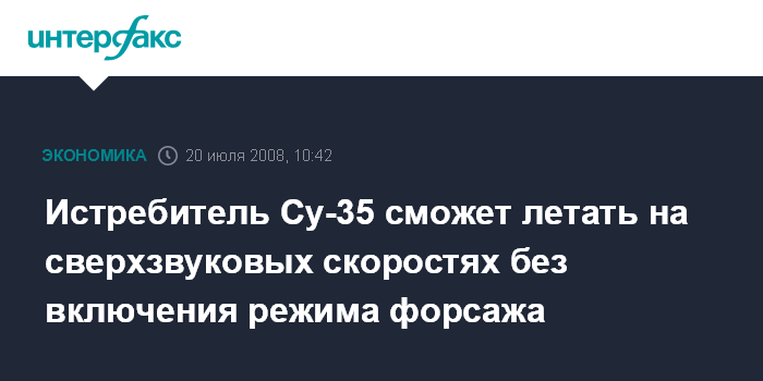 Москва. 20 июля. INTERFAX.RU - Конструкторы Авиационной холдинговой компании "Сухой" прорабатывают возможность сверхзвукового бесфорсажного полета многоцелевого истребителя Су-35, заявил "Интерфаксу-АВН" директор программы создания истребителя в компании "Сухой" Игорь Демин.