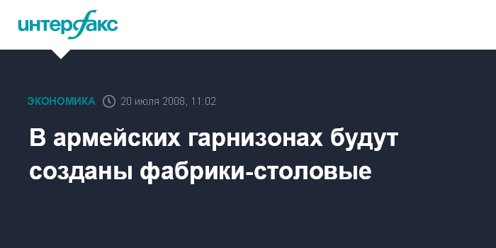 Москва. 20 июля. INTERFAX.RU - Завершены работы по созданию типовых объектов продовольственной службы (столовых) для воинских частей, сообщил "Интерфаксу-АВН" начальник службы информации и общественных связей Службы расквартирования и обустройства министерства обороны (МО) РФ Василий Лавренюк.