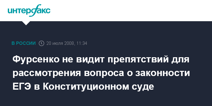 Москва. 20 июля. INTERFAX.RU - Министр образования и науки РФ Андрей Фурсенко не возражает против рассмотрения в Конституционном суде вопроса о законности введения Единого госэкзамена (ЕГЭ) в России.