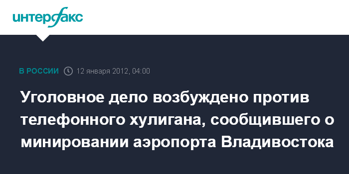 Уголовное дело возбуждено по ст. 207 УК РФ (заведомо ложное сообщение об акте терроризма), сообщили в четверг агентству "Интерфакс-Дальний Восток" в пресс-службе УМВД по Приморью.
