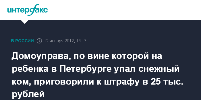 Санкт-Петербург. 12 января. INTERFAX.RU - Суд Петербурга приговорил к штрафу в 25 тыс. рублей домоуправа, виновную в падении снега с крыши на малолетнего ребенка, сообщает сайт Главного управления СКР по городу в четверг.