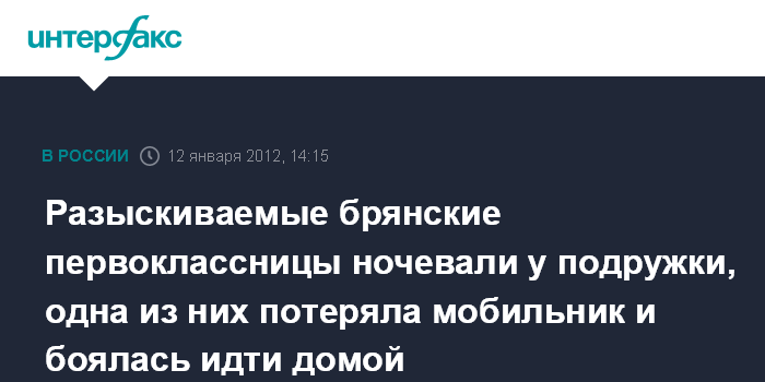 Москва. 12 января. INTERFAX.RU - Пропавшие в Брянске школьницы обнаружены в квартире своей одноклассницы, где они остались на ночь, испугавшись вернуться домой, сообщили "Интерфаксу" в пресс-службе управления МВД по Брянской области.