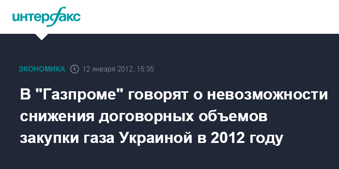 Москва. 12 января. INTERFAX.RU - Контрактный объем закупки Украиной в 2012 году не может быть снижен до требуемого Украиной уровня в 27 млрд куб. м газа в год, заявил Агентству газовой информации (АГИ) официальный представитель "Газпрома" (РТС: GAZP) Сергей Куприянов.