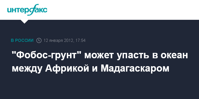 Москва.12 января. INTERFAX.RU - Специалисты Роскосмоса уточнили время и место возможного падения обломков российской межпланетной станции "Фобос-Грунт".