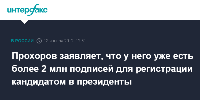 Москва. 13 января. INTERFAX.RU - Бизнесмен Михаил Прохоров собрал в свою поддержку более 2 млн подписей, которые необходимы для его регистрации кандидатом в президенты России.