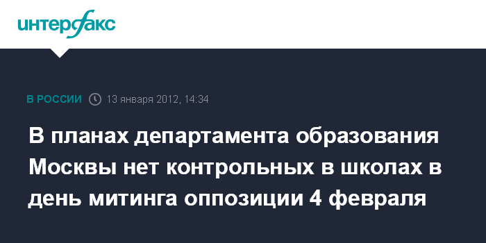 На вопрос "Интерфакса", есть ли в планах департамента образования контрольные работы, назначенные на 4 февраля, когда в Москве ожидаются массовые акции оппозиции, О.Голодец ответила: "Нет. Моя абсолютно четкая позиция, что активно вовлекать несовершеннолетних детей в политическую жизнь и выводить их на площади - это безответственно по отношению к детям".