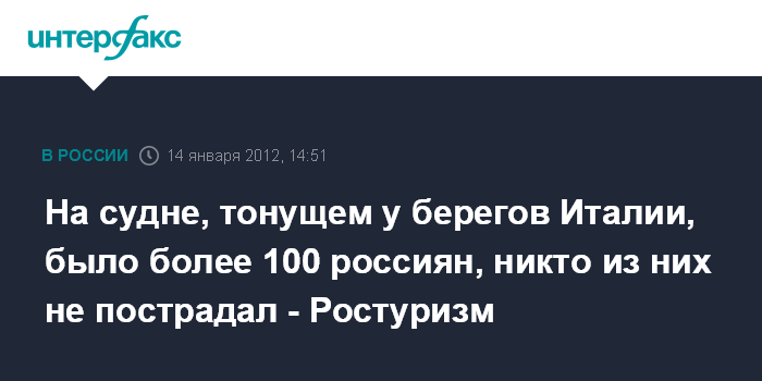 Москва. 14 января. INTERFAX.RU - На борту лайнера "Costa Concordia" находилось 108 граждан РФ; по предварительным данным, пострадавших и погибших среди них нет, сообщили "Интерфаксу" в Ростуризме в субботу. Между тем собеседник агентства отметил, что точных списков российских туристов пока нет.