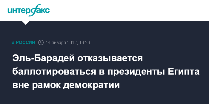 Каир. 14 января. INTERFAX.RU - Наиболее вероятный кандидат на должность президента Египта, бывший глава МАГАТЭ Мухаммед эль-Барадей отказался от участия в предстоящих в 2012 году президентских выборах.