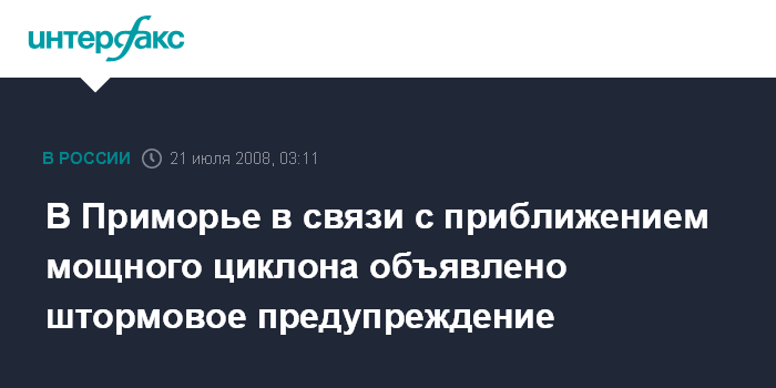 Как сообщили агентству "Интерфакс-Дальний Восток" в Главном управлении МЧС по Приморью, по прогнозам синоптиков в течение понедельника, а также в ночь на вторник южные районы края будут находиться во власти тропического циклона, который принесет с собой ливни и сильный ветер. Скорость ветра на побережье будет достигать 23 метров в секунду.