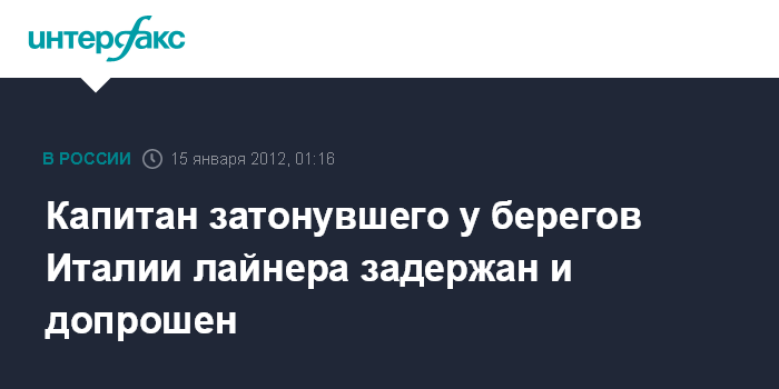 Лондон. 15 января. ИНТЕРФАКС - Итальянские власти задержали капитана круизного лайнера "Коста Конкордия", затонувшего у берегов Италии в Средиземном море, передает британская телерадиовещательная корпорация Би-би-си.