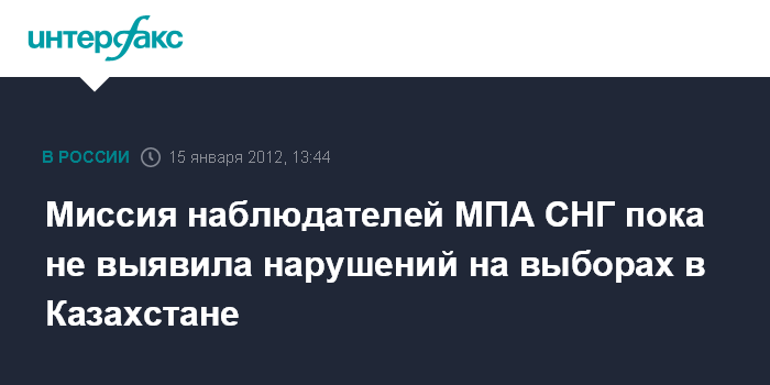 Астана. 15 января. INTERFAX.RU - Миссия наблюдателей Межпарламентской ассамблеи СНГ не зафиксировала нарушений в ходе голосования на выборах депутатов парламента Казахстана, сообщил глава миссии, российский сенатор Александр Торшин.