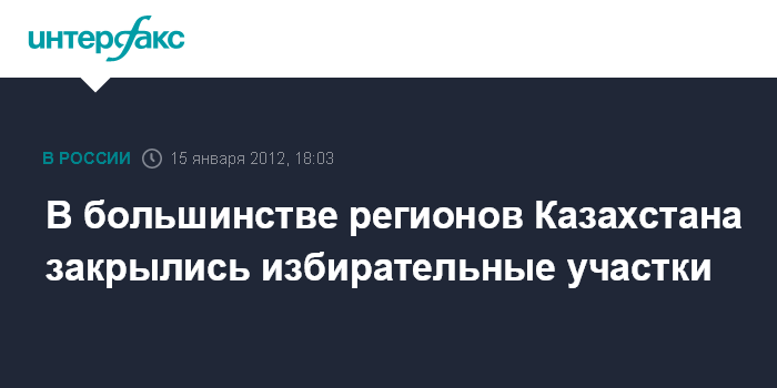 В 20:00 времени Астаны закрылись избирательные участки в 12 регионах республики. Между тем голосование продолжается в четырех западных областях - Актюбинской, Атырауской, Западно-Казахстанской и Мангистауской, которые находятся в другом часовом поясе (-1 час). Там избирательные участки закроются на один час позже (но также в 20:00 по местному времени).
