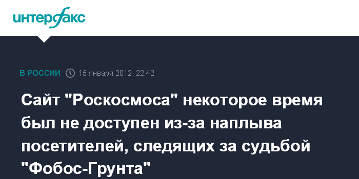 Москва. 15 января. INTERFAX.RU - Интернет-сайт Роскосмоса, где публикуются новости о межпланетной станции "Фобос-Грунт", упавшей в Тихом океане, прервал на некоторое время свою работу.