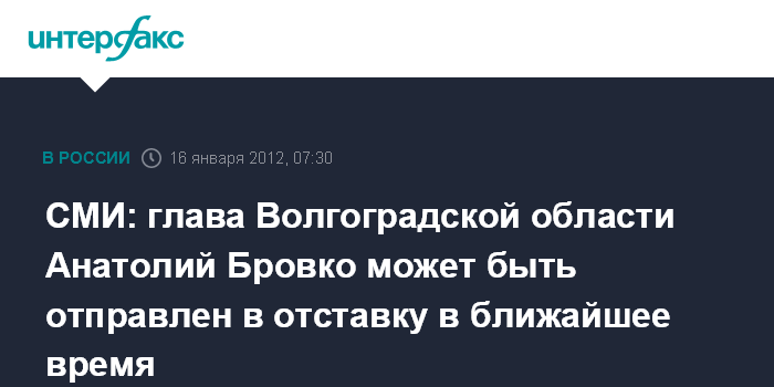 Москва. 16 января. INTERFAX.RU - Вслед за уволенным губернатором Архангельской области Ильей Михальчуком в отставку президент может отправить руководителя Волгоградской области Анатолия Бровко, пишет в понедельник газета "Известия".