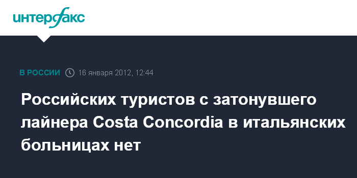 Москва. 16 января. INTERFAX.RU - В больницах Италии не осталось россиян, пострадавших в результате крушения круизного судна Costa Concordia у берегов этой страны, сообщили "Интерфаксу" в консульском отделе посольства РФ в Риме.