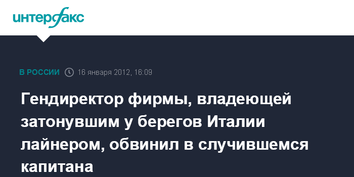 Рим. 16 января. INTERFAX.RU - Действия капитана затонувшего у берегов Италии круизного лайнера "Коста Конкордия" Франческо Скеттино противоречат правилам кампании и стали прямой причиной кораблекрушения, заявил в понедельник генеральный директор фирмы Costa Cruises Пьер-Луиджи Фоски на пресс-конференции.