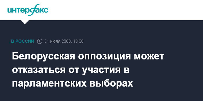 Москва. 21 июля. INTEFAX.RU - Председатель Объединенной гражданской партии Белоруссии Анатолий Лебедько не исключает, что белорусская оппозиция откажется от участия в выборах депутатов Палаты представителей Национального собрания Белоруссии, которые пройдут 28 сентября 2008 года.