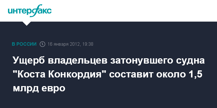 Ранее итальянское телевидение сообщило, что владелец затонувшего судна "Коста Конкордия" компания Costa Crociere понесет ущерб примерно в 1,5 млрд евро.