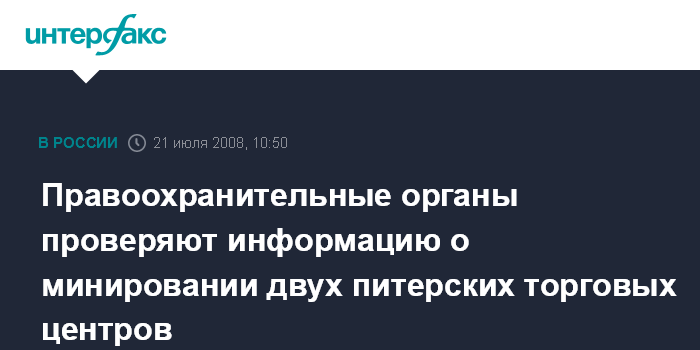 Санкт-Петербург. 21 июля. INTERFAX.RU - В двух торговых центрах, расположенных в разных районах Северной Столицы, проверяют анонимные сообщения о заложенных взрывных устройствах, сообщили "Интерфаксу" в городском управлении МЧС.