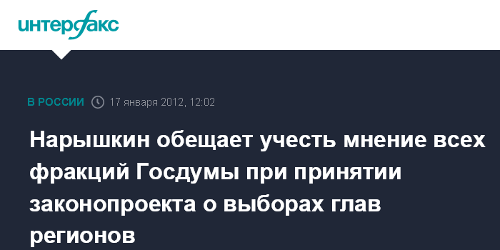 Москва. 17 января. INTERFAX.RU - Председатель Госдумы Сергей Нарышкин заявил, что президентский законопроект о прямых выборах губернаторов будет принят с учетом точек зрения всех парламентских фракций.
