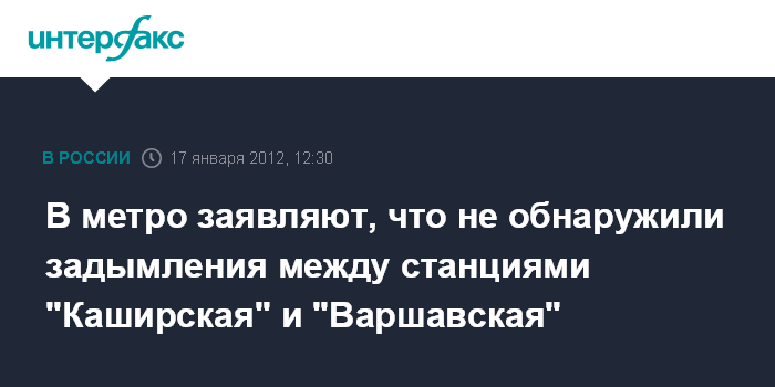 Москва. 17 января. INTERFAX.RU - На перегоне между станциями "Каширская" и "Варшавская" Каховской линии столичного метро в настоящее время никакого задымления нет, заявили "Интерфаксу" в пресс-службе метро.