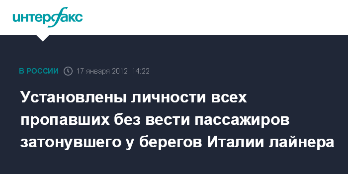 Рим. 17 января. INTERFAX.RU - Береговой охране Италии во вторник удалось установить личности всех 29 пропавших без вести пассажиров потерпевшего крушение круизного лайнера Costa Concordia.