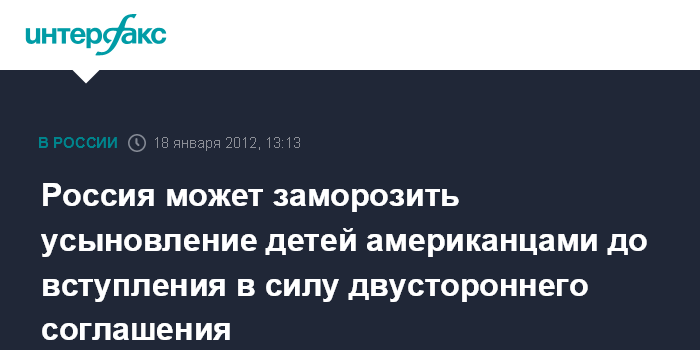 "До того, как это соглашение вступит в силу, до того, как в соответствии с этим соглашением Госдепартамент будет нести ответственность, по сути дела, за судьбу каждого ребенка, по крайней мере контролировать, как дети чувствуют себя в приемных семьях, мы, наверное, будем обращаться в нашу судебную систему вместе с Павлом Астаховым с тем, чтобы до вступления в силу этого соглашения заморозить рассмотрение просьб об усыновлении наших детей американцами", - сказал глава МИД России Сергей Лавров на ежегодной пресс-конференции в Москве.