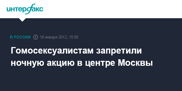 Москва. 18 января. INTERFAX.RU - Мэрия Москвы запретила гей-активистам провести ночную акцию "Спокойной ночи, малыши!" в годовщину решения Конституционного суда РФ, признавшего правомерным запрет пропаганды гомосексуализма среди детей.