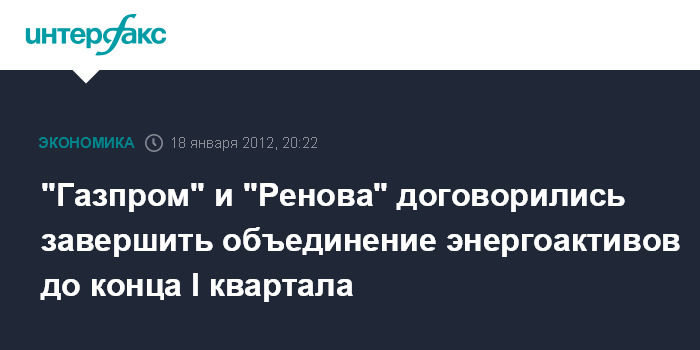 Москва. 18 января. INTERFAX.RU - "Газпром" и холдинг "Ренова" Виктора Вексельберга после того, как им не удалось совершить сделку по объединению энергоактивов в первоначальные сроки - до конца прошлого года, поставили себе новый дедлайн - конец первого квартала 2012 года.