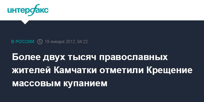 "Всего на Камчатке было определено 9 мест, где верующие "моржи" могли окунуться в крещенскую купель на открытом воздухе в ночь на 19 января. Это водоемы в Петропавловске-Камчатском, Елизовском, Усть-Большерецком, Карагинском, Мильковском и Усть-Камчатском районах края", - сообщил агентству "Интерфакс-Дальний Восток" в четверг представитель ГУ МЧС по Камчатскому краю.