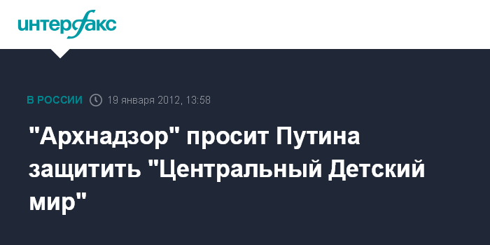 Москва. 19 января. INTERFAX.RU - "Архнадзор" направил обращение в адрес главы Правительства Российской Федерации Владимира Путина с просьбой вмешаться в ситуацию, сложившуюся вокруг объекта культурного наследия регионального значения, здания универмага "Детский мир" на Лубянской площади в Москве, говорится в сообщении общественного движения.