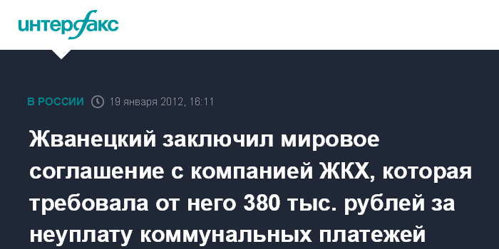 Москва. 19 января. NTERFAX.RU - Компания "Санраш", которая требовала от писателя-сатирика Михаила Жванецкого 380 тыс. рублей за неуплату коммунальных платежей, заключила с ним мировое соглашение.