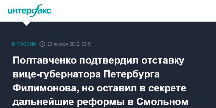 "Правда", - ответил на своей странице в Твиттере губернатор Петербурга Георгий Полтавченко на вопрос одного из своих подписчиков об отставке Филимонова.