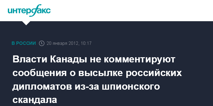 Оттава. 20 января. INTERFAX.RU - Руководство Канады пока не дает комментариев по поводу появившихся в местных СМИ информации о высылке из страны нескольких сотрудников посольства РФ, якобы получавших секретные сведения от канадского офицера, пишет в пятницу газета Vancouver Sun.