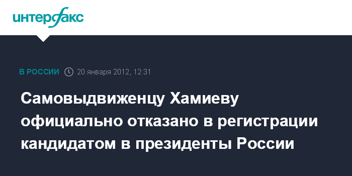 Москва. 20 января. INTERFAX.RU - Общественный деятель Ринат Хамиев, претендовавший ранее на пост президента РФ, получил официальный отказ Центризбиркома в регистрации своей кандидатуры.