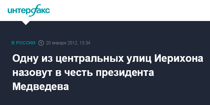 Горки. 20 января. INTERFAX.RU - Жители города Иерихон приняли решение назвать одну из центральных улиц именем президента РФ Дмитрия Медведева, сообщил глава Палестинской национальной администрации ПНА Махмуд Аббас.