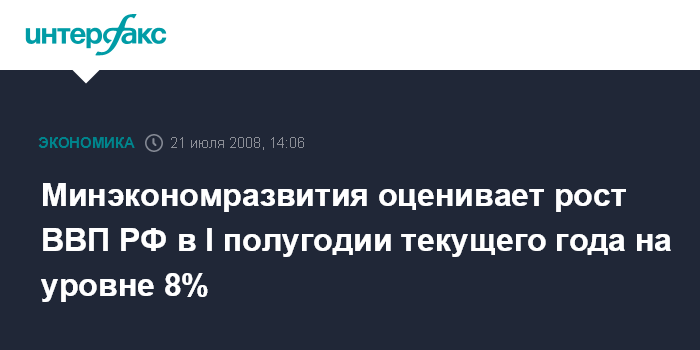 Рост ВВП РФ в I полугодии 2008 г., по оценке Минэкономразвития, составил 8,0% по сравнению с I полугодием 2007 года.